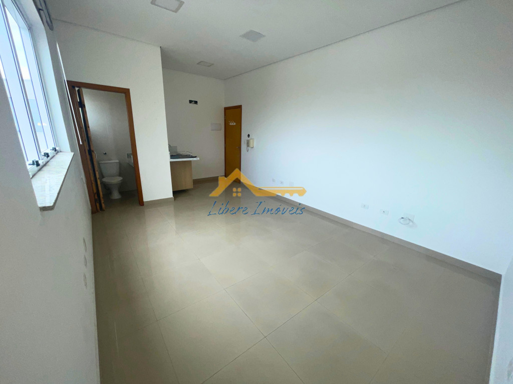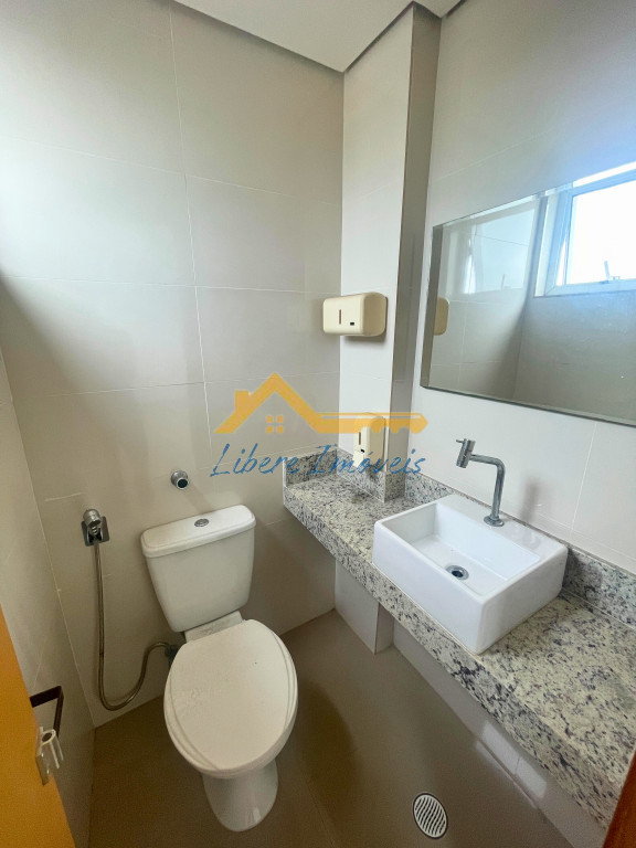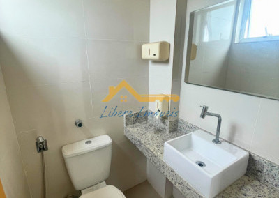 A sala possui banheiro privativo com acabamento em porcelanato e bancada em granito, além de uma copa compacta com pia e armário planejado, oferecendo mais comodidade para o seu negócio.